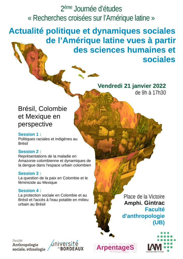 Ana Carla Rocha de Oliveira, docteure associée à LAM, organise la deuxième journée d’études « Recherches croisées sur l’Amérique latine », qui aura lieu le vendredi 21 janvier de 9h à 17h sur le site Victoire de l’Université de Bordeaux (amphi Gintrac).