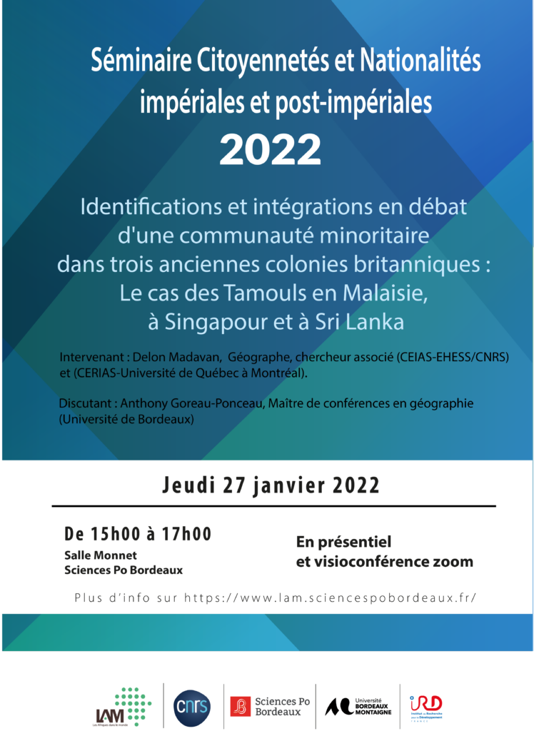 Delon Madavan, Géographe, chercheur associé (CEIAS-EHESS/CNRS) et (CERIAS-Université de Québec à Montréal) – sera l’invité de la première séance 2022 du séminaire Citoyennetés et Nationalités impériales et post-impériales et consacrée au thème : Identifications et intégrations en débat d’une communauté minoritaire dans trois anciennes colonies britanniques : Le cas des Tamouls en Malaisie, à Singapour et à Sri Lanka.