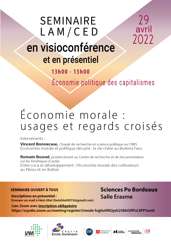 Avec pour objet la culture de coca dans deux régions de production au Pérou (Vallée des fleuves Apurimac, Ene et Mantaro) et en Bolivie (Tropique de Cochabamba), cette présentation aborde le concept d’économie morale en tant qu’économie de subsistance soutenant un ensemble de pratiques populaires. Plusieurs modalités opératoires de l’économie morale seront explorées : les traditions inventées autour de la coca qui soutiennent les formes de gouvernement au niveau rural ; les calculs moraux opérés dans la distribution des ressources (droit à produire de la coca, postes à responsabilités et projets de développement) et dans la participation aux mobilisations. En guise d’ouverture, je reviendrai sur la notion de « consensus populaire », omniprésente dans la définition de l’économie morale, mais qui pose certains soucis d’objectivation. Ce pas de côté permettra d’interroger les liens qui peuvent exister entre économie morale et économie de pouvoir.