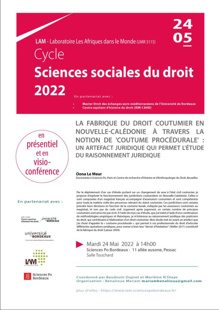 Oona Le Meur, Assistante en Histoire du droit et des Institutions à l’Université Libre de Bruxelles, interviendra sur la thématique : « La fabrique du droit coutumier en Nouvelle-Calédonie à travers la notion de ‘coutume procédurale’ : un artefact juridique qui permet l’étude du raisonnement juridique ».