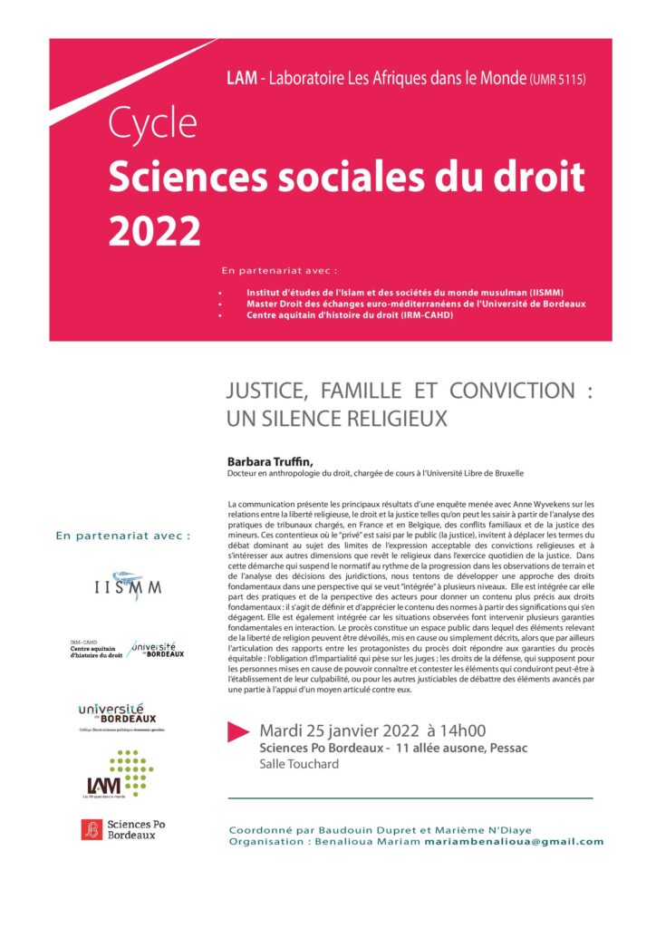 Barbara Truffin – docteure en anthropologie du droit et chargée de cours à l’Université libre de Bruxelles – sera l’invitée de la première séance 2022 du séminaire Sciences sociales du droit, coordonné par Baudouin Dupret et Marième N’Diaye et consacrée au thème : « Justice, famille et conviction : un silence religieux ».