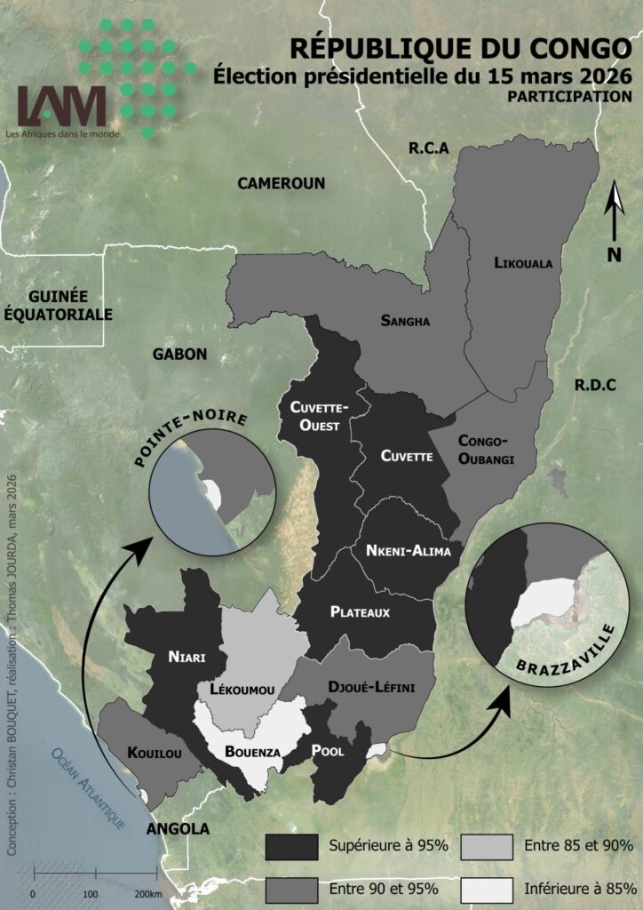 – Une carte de la participation par département, où la gradation s’échelonne entre 99,15 % dans le Nkeni-Alima et 74,06 % à Brazzaville.