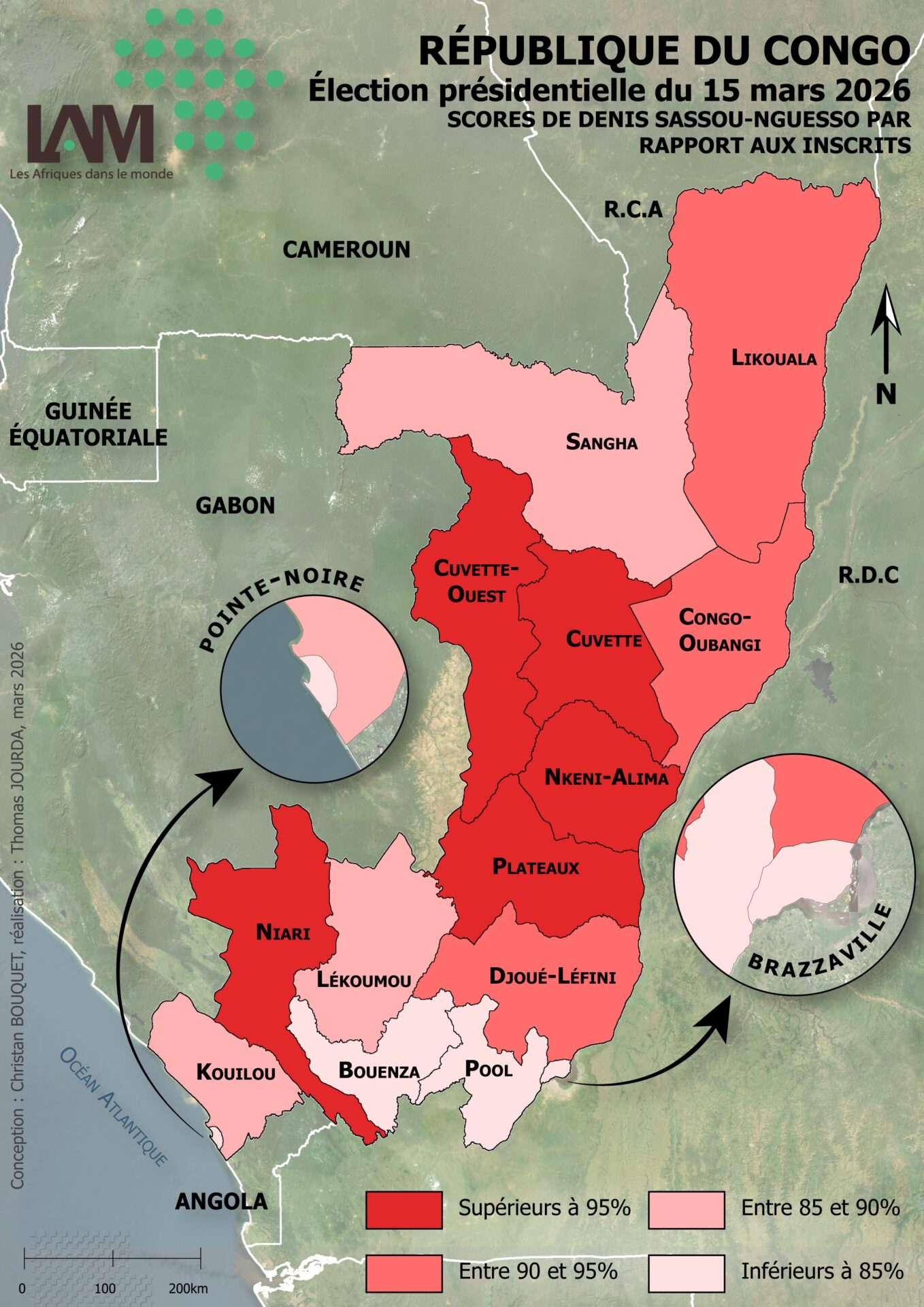 – Une carte des scores par rapport aux inscrits obtenus par Denis SASSOU-NGUESSO, qui sont relativement bas dans le gros département de Brazzaville (69,8 %, pour 996 446 inscrits), et les plus élevés dans le Nkeni-Alima.