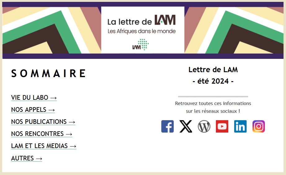 Lettre de LAM – été 2024 Publié 10 juillet 2024 · Mis à jour 3 octobre 2025 La Lettre de LAM de l’été 2024 est en ligne !Lire Pour vous abonner à la Lettre mensuelle de LAM, suivez ce lien: https://public.message-business.com/form/58664/5/form.aspx