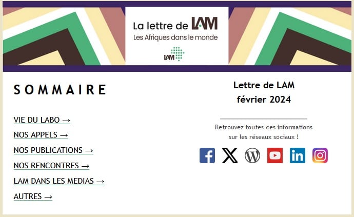 Lettre de LAM – février 24 Publié 12 février 2024 · Mis à jour 3 octobre 2025 La Lettre de LAM de février 2024 est en ligne !Lire Pour vous abonner à la Lettre mensuelle de LAM, suivez ce lien: https://public.message-business.com/form/58664/5/form.aspx Share